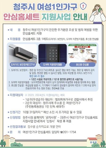 한편 청주시는 교제폭력, 스토킹, 주거침입 등 여성 대상 범죄를 예방하고자 2022년 ‘청주시 1인가구 안정망 지원에 관한 조례’를 제정하고 청주흥덕경찰서, SK쉴더스(주)와 협업해 여성가구 범죄 예방에 힘쓰고 있다.