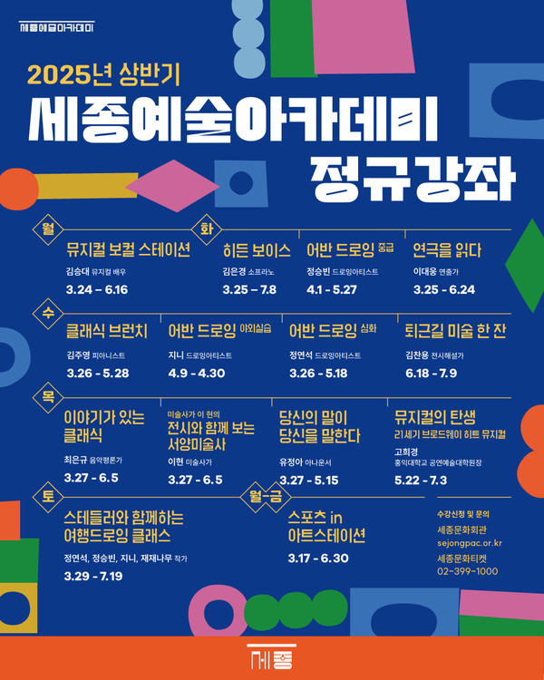 [서울시티 선정진 기자] 세종문화회관(사장 안호상)이 운영하는 문화예술 교육 프로그램 ‘세종예술아카데미’가 오는 3월 24일부터 7월 19일까지 진행된다.
