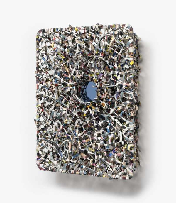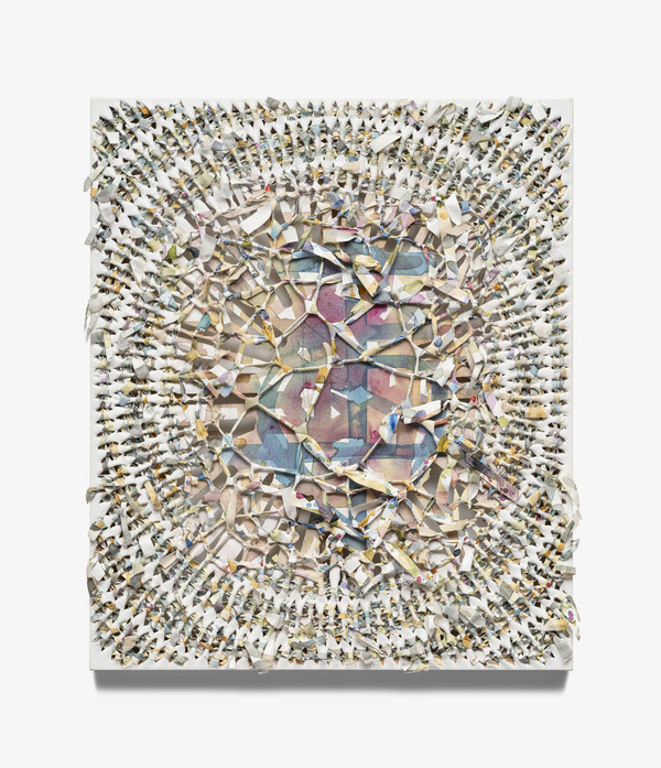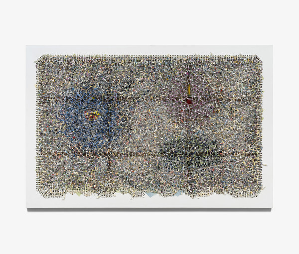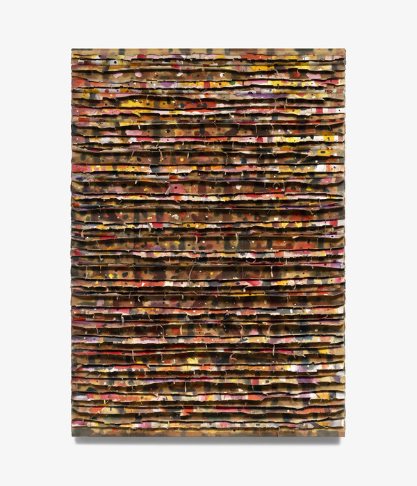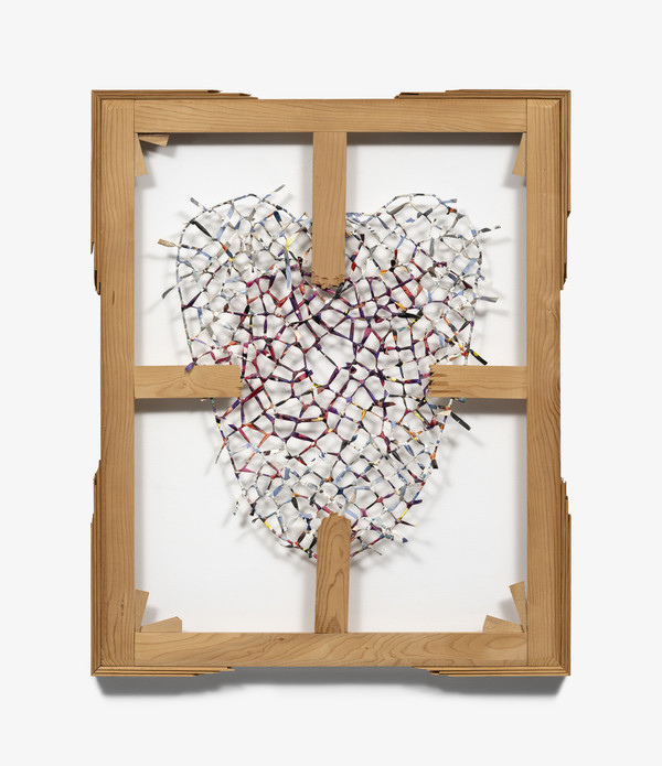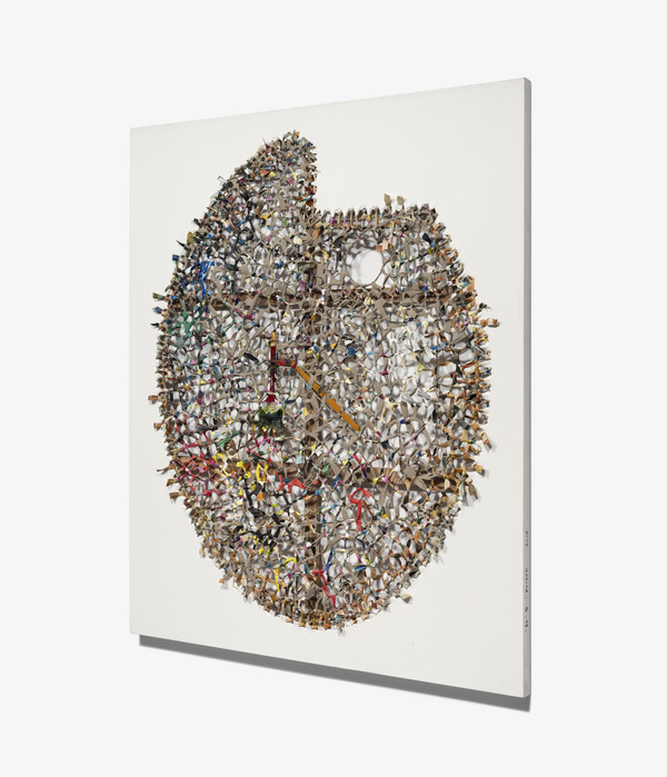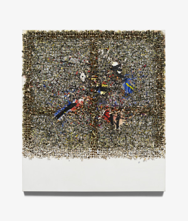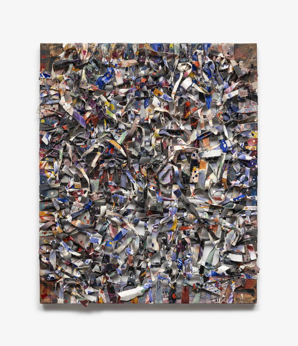갤러리에 들어서서 처음으로 마주하게 되는 1층 공간은 파리를 오가며 성북동 작업실에 머물던 시기에 완성된 작업들이다. 전시장 가운데에서 관객을 맞이하는 〈회화로부터〉(2009)는 ‘누아주’ 시리즈의 비전을 잘 보여주는 작품이다. 색의 연금술사로도 불렸던 작가는 말려진 캔버스 롤을 바닥에 펼쳐 만족할 때까지 액션 페인팅 스타일의 추상회화를 그렸다. 다음으로 그 캔버스를 뒤집어 자로 정확히 일정 간격으로 선을 그어 가위로 잘라냈다. 잘린 색 띠들은 작업실 한쪽에 정렬되어 걸렸다. 작업에 대한 영감이 떠오르면 마치 거미가 거미줄로 집을 짓듯 신성희는 직관적으로 색 띠들을 직조해 입체적인 회화를 완성했다. 이 과정에서 2차원의 평면 캔버스는 1차원적 선으로 치환되었다가 화가의 손에 의해 허공에서 재조합되어 입체적인 몸을 가진 회화로 완성되었다.