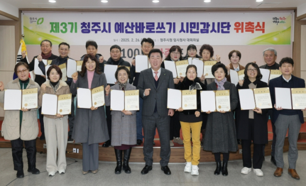 [서울시티 김청월 기자] 청주시는 26일 오전 임시청사에서 제3기 예산바로쓰기 시민감시단 위촉식을 개최했다. 이범석 청주시장은 시민감시단으로 위촉된 23명인에게 위촉장을 전달했다.