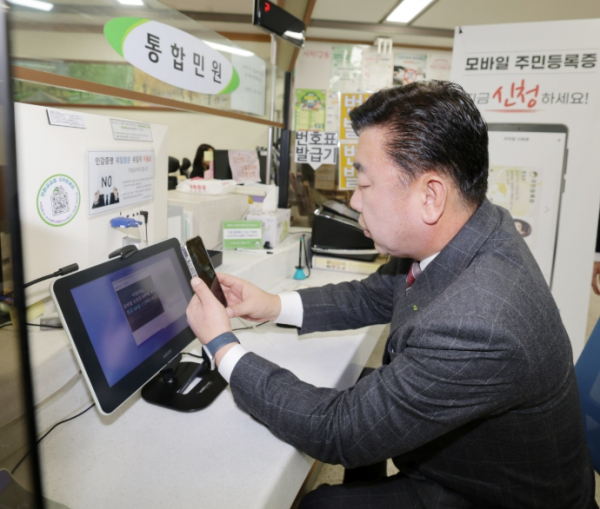 이 시장은 행정복지센터 담당 공무원이 제시한 QR코드를 본인의 휴대전화로 촬영해, 수수료 없이 약 5분 만에 모바일 주민등록증을 받았다.