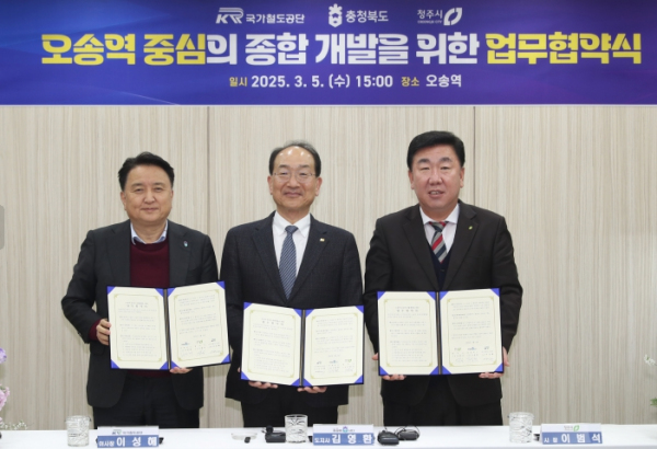 협약식에는 이범석 청주시장, 김영환 충북도지사, 이성해 국가철도공단이사장이 참석해 오송역 발전과 주변 개발을 위해 협력하기로 뜻을 모았다.