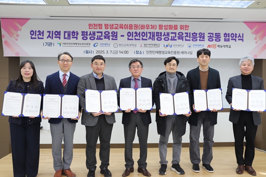 [서울시티 선정진 기자] 인천인재평생교육진흥원이 2025년부터 인천형 평생교육이용권(바우처) 전담기관으로 지정됨에 따라, 지난 7일 인천 지역 6개 지역 대학 평생교육원과 업무 협력 체계 구축 및 활성화를 위한 공동 협약식을 개최했다고 밝혔다.