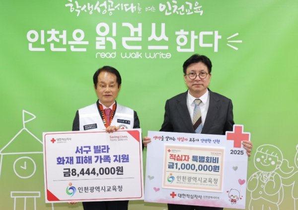 [서울시티 선정진 기자] 인천광역시교육청은 지난 2월 26일 서구 빌라 화재로 안타깝게 세상을 떠난 초등학생의 유가족을 돕기 위해 모금한 성금 844만 4천 원을 18일 대한적십자사 인천지사에 전달했다.