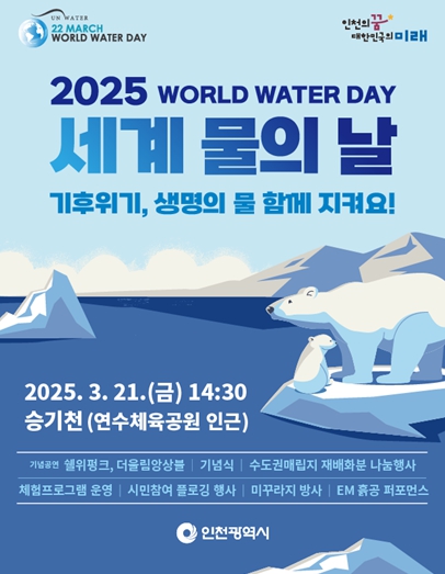 [서울시티 선정진 기자] 인천광역시는 3월 21일 승기천에서 시민 500여 명이 참석한 가운데 ‘기후위기, 생명의 물 함께 지켜요’라는 주제로 2025년 세계 물의 날을 기념하는 행사를 개최했다고 밝혔다.