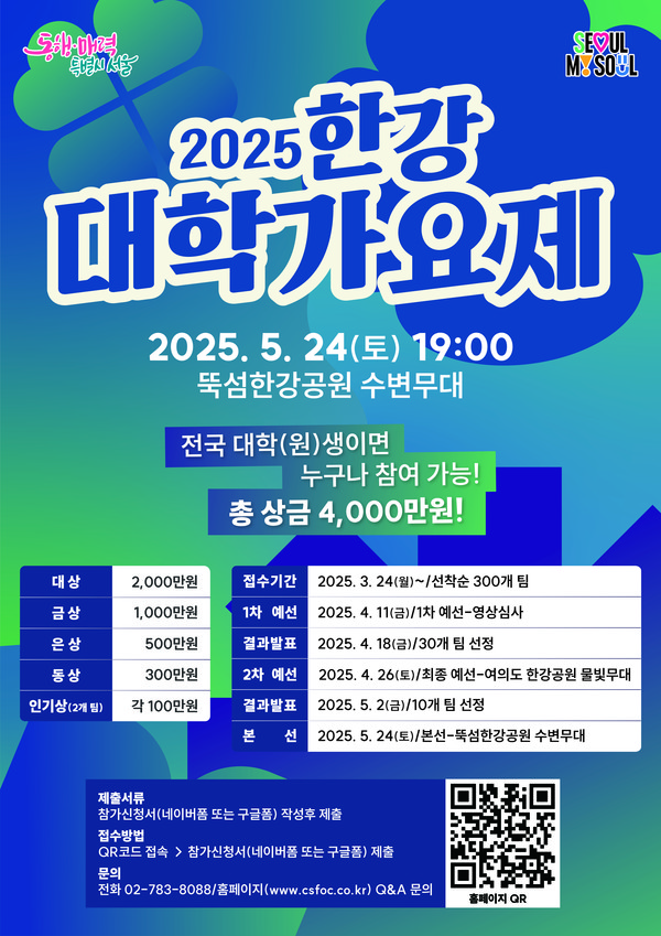 [서울시티 선정진 기자] 서울시는 5월 24일(토) 저녁 7시, 뚝섬한강공원 수변무대에서 개최되는 ‘2025 한강 대학가요제’의 참가자 300팀에 대한 접수를 오는 24일(월)부터 시작한다고 밝혔다.