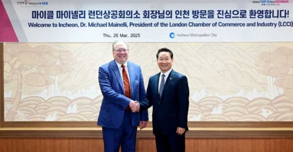 [서울시티 선정진 기자] 인천광역시는 3월 26일 런던상공회의소 회장이자 영국의 세계적인 컨설팅 기업 지옌그룹(Z/Yen Group)의 마이클 마이넬리 회장이 인천을 방문해 유정복 시장을 예방했다고 밝혔다.