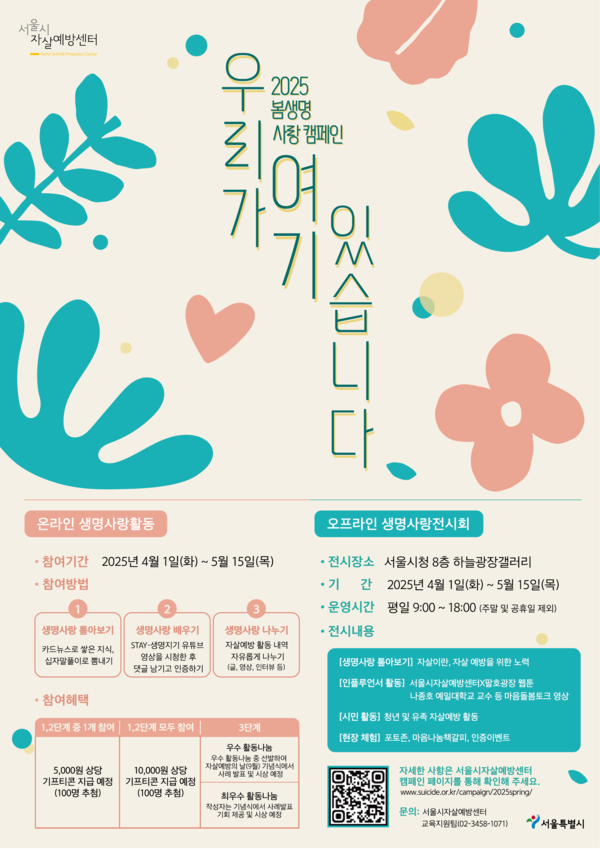 서울시는 이번 전시회와 더불어 온라인 자살 예방 인식 개선 캠페인 ‘생명사랑 활동’도 진행한다. 캠페인은 총 3단계 미션으로 구성되며, 시민들이 참여함으로써 생명 존중의 가치를 되새기고 일상 속에서 자살 예방 실천에 동참할 수 있도록 한다.