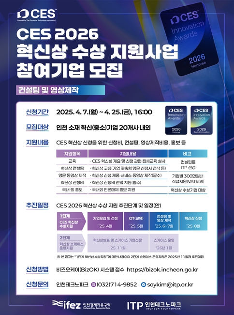 [서울시티 선정진 기자] 인천경제자유구역청은 ‘CES 2026 혁신상 수상지원사업’에 참여할 혁신 기업을 오는 25일까지 모집한다고 밝혔다.