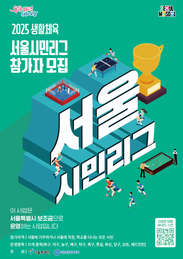 [서울시티 선정진 기자] 서울시가 생활체육을 즐기는 시민이라면 누구나 주인공이 되어 선수로 활동해 볼 수 있는 ‘2025 서울시민리그(S-리그)’에 참여할 1만여 명을 4월 14일(월)부터 종목별로 모집한다.