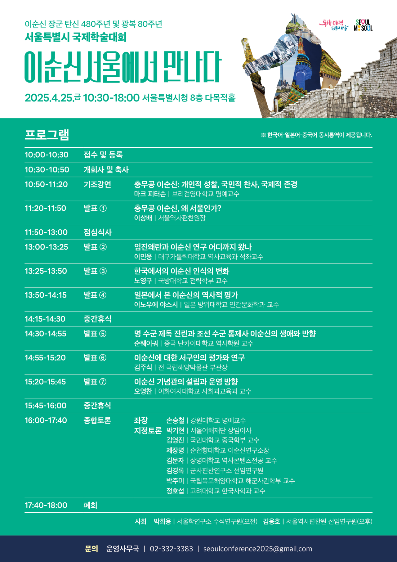 [서울시티 선정진 기자] 서울시는 4월 25일(금) 오전 10시 30분, 서울시청 본관 8층 다목적홀에서 이순신 장군 탄신 480주년을 기념하는 국제학술대회 ‘이순신 서울에서 만나다’를 개최한다고 밝혔다.