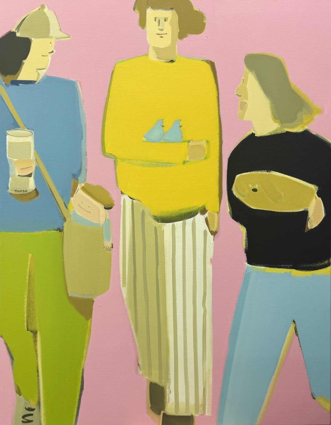 개인전과 국내외 아트페어를 통해 뜨거운 주목을 받고 있는 백윤조(b.1980) 그녀의 대표적인 ‘Walk’ 시리즈는 ‘걷기’라는 행위를 중심으로, 인물들이 단순한 선과 밝은 색채로 표현되어 있다. 이 시리즈는 작가가 개인적으로 힘든 시기에 ‘걷기’를 통해 마음의 응어리를 풀어낸 경험에서 출발하였다. 작품 속 인물들은 고양이, 개, 새 등 작은 존재들과 함께하며 일상에서 간과하기 쉬운 ‘작은 것’들의 소중함과 따뜻함을 환기시킨다.