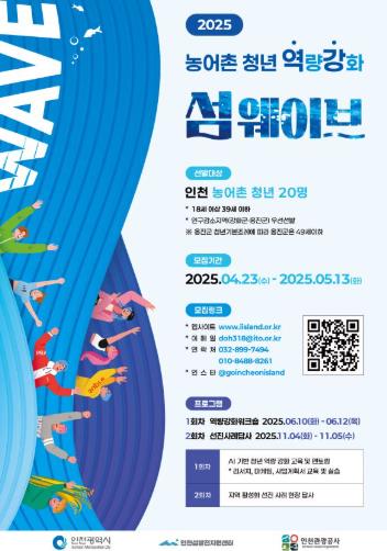 [서울시티 선정진 기자] 인천광역시와 인천섬발전지원센터는 인구 감소가 심화되고 있는 인천 농어촌 지역의 지속가능한 미래를 위해, 청년의 창업과 정착 기반 마련을 지원하는‘2025 인천 농어촌 청년 역량강화 프로그램 섬웨이브’참가자를 5월 13일까지 모집한다.