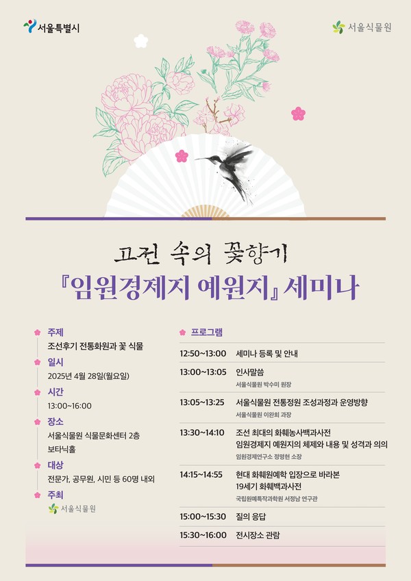 또한, 전시와 연계해 4월 28일(월) 13:00~16:00에 세미나가 진행된다. 세미나에서는『조선 후기 전통 화원과 꽃식물』을 주제로, 『예원지』에 기록된 65종의 꽃식물과 전통 정원의 철학을 소개한다. 이를 통해 조선 후기 꽃문화 기록이 오늘날 정원 운영에 어떻게 적용할 수 있을지를 공유하고, 시민과 함께 전통 정원의 가치를 재발견하는 계기를 마련하고자 기획되었다.