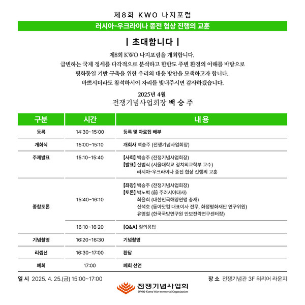 [서울시티 선정진 기자] 전쟁기념사업회(회장 백승주)는 25일(금) 오후 전쟁기념관 3층 워리어라운지에서 「러시아-우크라이나 종전 협상 진행의 교훈」이라는 주제로 <제8회 KWO 나지포럼>을 개최한다.