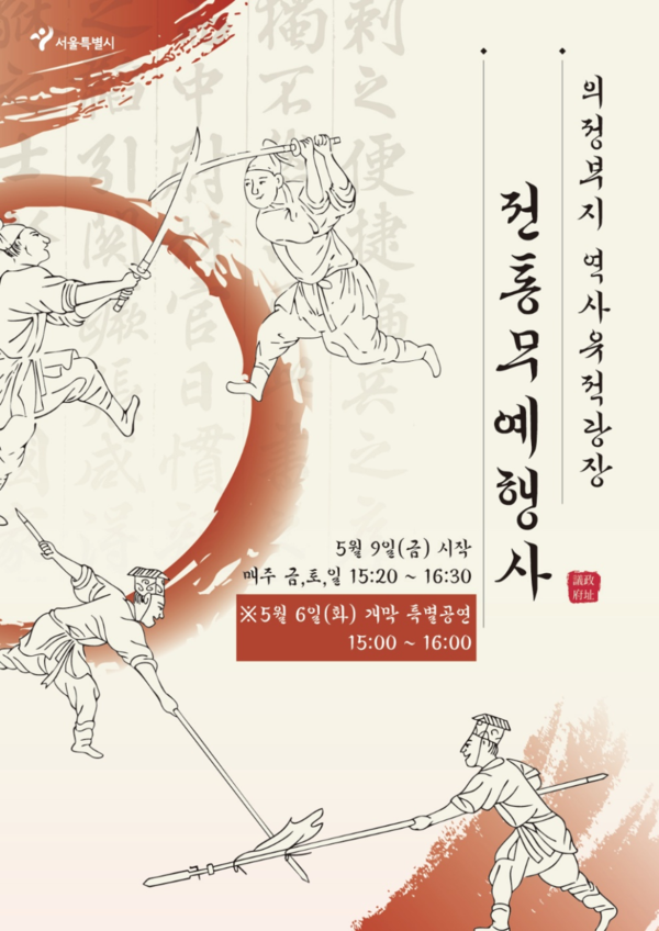 [서울시티 선정진 기자] 서울시가 광화문 앞 의정부지 역사유적광장을 전통문화 관광명소로 본격 육성한다. 대체 공휴일인 오는 5월 6일(화), 개막 특별공연을 시작으로 매주 금요일, 토요일, 일요일 오후 3시 20분부터 4시 30분까지 ‘조선시대 전통무예 시연행사’를 상설로 개최한다고 밝혔다.