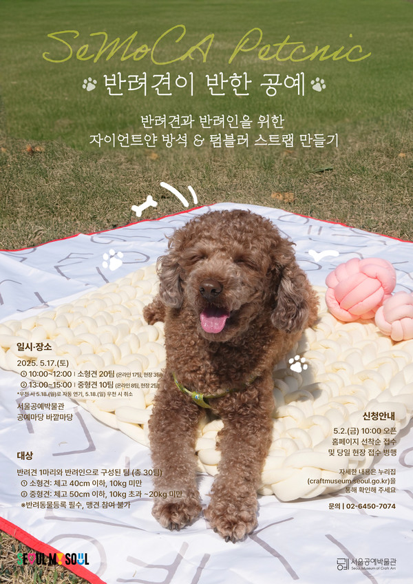 올해는 시민 의견을 반영해 참여 대상을 기존 소형견 가족에서 중형견 가족까지 확대했다. 오전 10시부터 12시까지는 소형견(체고 40cm이하, 10kg 미만) 20팀이, 오후 1시부터 3시까지는 중형견(체고 50cm 이하, 10~20kg 미만) 10팀이 참여할 수 있다. 총 30팀 중 5팀(25팀은 사전접수)은 당일 현장에서 모집할 예정이며, 자세한 안내는 서울공예박물관 누리집에서 확인 가능하다.