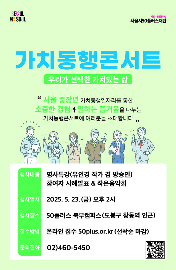 가치동행콘서트는 올해 총 3차례에 걸쳐 열릴 예정이며, 이번이 첫 번째 무대다. 중장년 세대는 물론, 사회공헌 활동에 관심 있는 시민 누구나 참여할 수 있다. 참가 신청은 서울시50플러스포털(50plus.or.kr)에서 5월 18일(일)까지 가능하다.