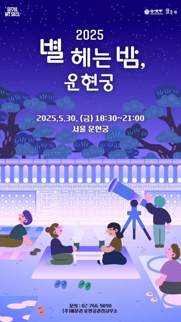 별빛 아래 고즈넉한 한옥의 정취를 즐기는 <별 헤는 밤> 운현궁은 5.30.(금) 18시 30분부터 개최된다. 운현궁 야간해설과 함께 초여름 밤하늘의 별을 관측하고, 운현궁 앞마당 돗자리에 앉아 다도체험을 하는 대표 인기 프로그램이다.