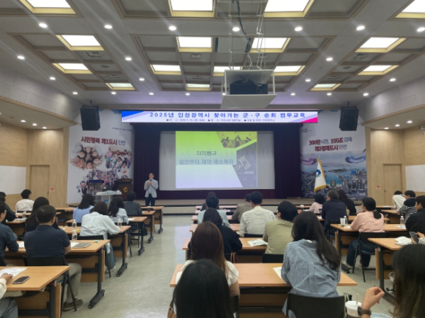 ‘찾아가는 군·구 순회 법무교육’은 인천시(법무담당관)가 시 및 군·구 공무원을 대상으로 법무 전반에 대한 체계적인 실무 교육을 통해 자치입법 역량을 강화하고자 매년 실시하고 있다. 이번 교육에 이어 올해 하반기에는 부평구(7월 18일), 미추홀구(7월 24일), 강화군(7월 25일), 계양구(9월 12일) 등 총 5회에 걸쳐 순차적으로 진행될 예정이다.