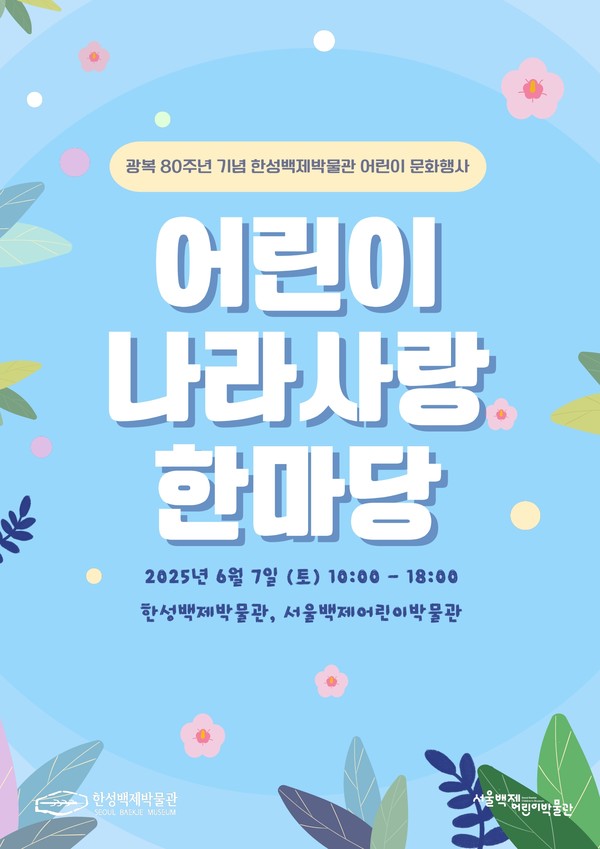 [서울시티 선정진 기자] 한성백제박물관(관장 김지연)이 ‘호국 보훈의 달’ 6월을 맞아, 박물관을 찾은 어린이들이 즐겁게 참여하며 자연스럽게 나라사랑의 의미를 배울 수 있는 ‘어린이 나라사랑 한마당’을 6.7.(토) 10시~18시, 한성백제박물관과 분관 서울백제어린이박물관 두 곳에서 개최한다. 특히 올해 광복 80주년을 맞이한 만큼 더욱 뜻깊은 행사가 될 예정이다.
