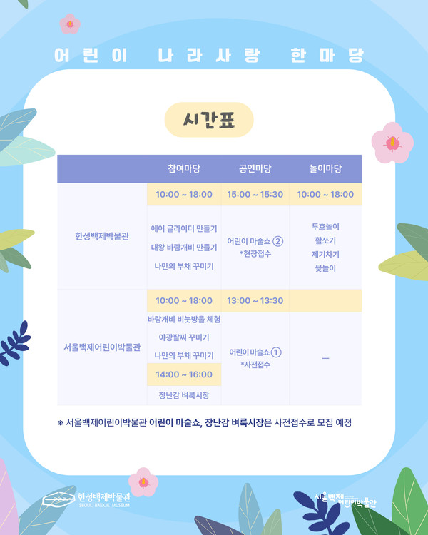 한성백제박물관 ‘어린이 나라사랑 한마당’과 관련한 자세한 내용은 박물관 누리집을 확인하면 된다.