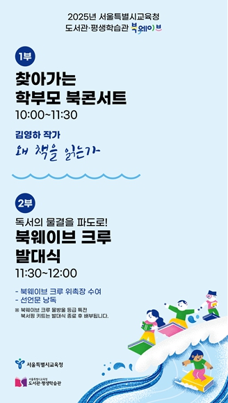 ‘찾아가는 학부모 북콘서트’는 서울시교육청 대표 독서캠페인 ‘북웨이브(Bookwave)’의 일환으로 마련됐으며, 학부모와 독서실천단 ‘북웨이브 크루’가 함께 참여하여 책을 매개로 공감과 소통의 장을 나누는 프로그램이다.