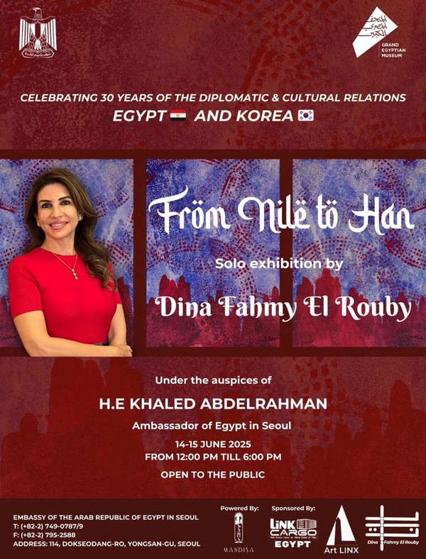 As part of the 30th anniversary of diplomatic and cultural ties between Egypt and Korea, renowned international Egyptian artist Dina Fahmy El Rouby has been invited to present her unique solo exhibition entitled From Nile to Han. This milestone event will be hosted at the Egyptian Embassy in Seoul under the auspices of His Excellency Mr. Khaled Abdel Rahman, whose initiative in bringing this exhibition to life stands as a testament to his commitment to strengthening cultural bonds between the two nations.