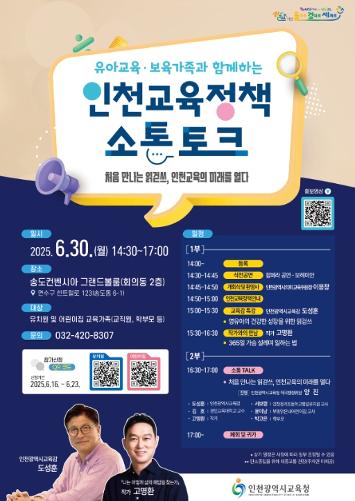 [서울시티 이상준 기자] 인천광역시교육청은 6월 30일, 송도컨벤시아에서 유치원 및 어린이집 학부모와 교직원을 대상으로 ‘유아교육·보육 가족과 함께하는 인천교육정책 소통 토크 – 처음 만나는 읽걷쓰, 인천교육의 미래를 열다’를 개최한다.