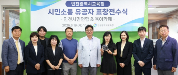 [서울시티 이상준 기자] 인천광역시교육청은 19일 ‘2025년 시민 소통 유공자 표창 전수식’을 열고, 시민 소통 활성화에 기여한 인천시민연합과 온라인 육아카페 대표 등 11명에게 교육감 표창을 수여했다.