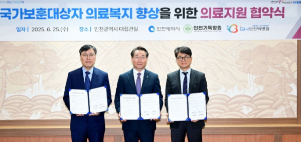 [서울시티 이상준 기자] 인천광역시는 6월 25일 시청 접견실에서 관내 종합병원인 인천기독병원 및 인천백병원과 국가보훈대상자 의료지원을 위한 협약을 체결했다고 밝혔다.