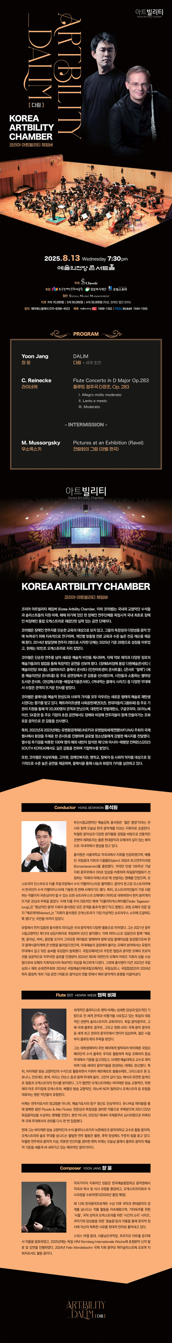 이번 무대에는 부산시립교향악단 예술감독 홍석원이 지휘봉을 잡고, 세계적인 오케스트라인 독일 바이에른 방송 교향악단 수석 플루티스트 헨릭 비제(Henrik Wiese)가 협연자로 나선다. 헨릭 비제는 라이네케의 플루트 협주곡을 직접 편곡해 이번 무대를 위해 새롭게 해석했으며, 무소르그스키의 ‘전람회의 그림’ 또한 아트빌리티 체임버만의 색채로 새롭게 탄생한다.