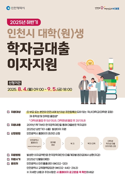 [서울시티 김청월 기자] 인천광역시는 대학(원)생들의 학자금대출 부담을 줄이기 위해 2025년 하반기 학자금대출 이자 지원신청을 오는 8월 4일부터 접수한다고 밝혔다.