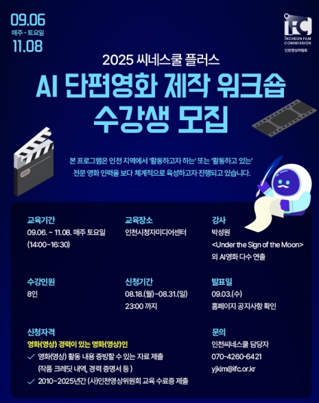 [서울시티 김청월 기자] 2025년 8월 14일 -- 인천영상위원회가 오는 18일부터 인천의 영화·영상인을 대상으로 ‘AI 단편영화 제작 워크숍’ 수강생을 모집한다.