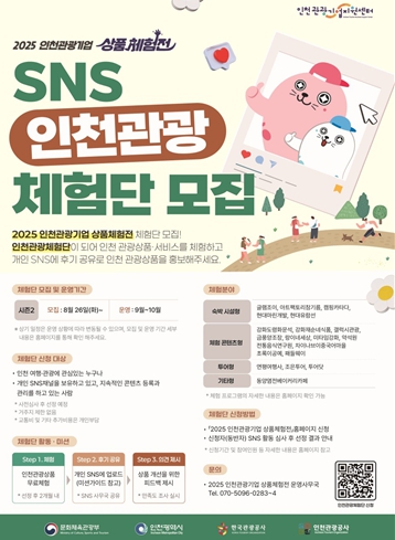 [서울시티 김청월 기자] 인천광역시와 인천관광공사는 인천 관광기업의 판로확대와 마케팅 지원을 위한 ‘2025 인천관광기업 상품체험전(이하, 체험전)’시즌2 체험단 모집을 8월 26일부터 시작했다고 밝혔다.