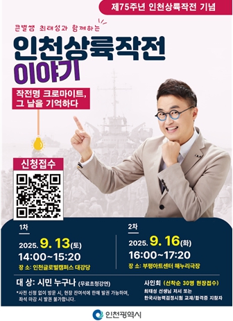 [서울시티 김청월 기자] 인천광역시는 인천상륙작전 75주년을 기념해 대한민국 대표 한국사 강사 큰별쌤 최태성과 함께하는‘작전명 크로마이트, 그날을 기억하다’를 개최한다고 밝혔다.