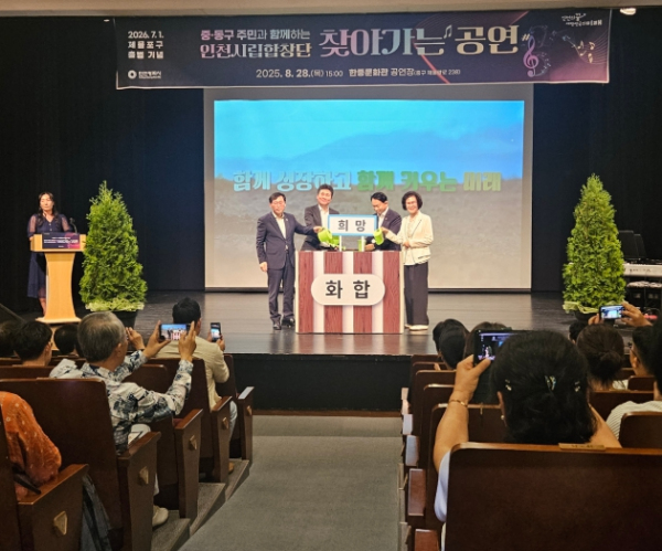 이날 공연에 앞서 김정헌 중구청장과 김찬진 동구청장이 함께한 ‘희망의 씨앗 심기 퍼포먼스’는 주민 공감과 연대를 바탕으로 제물포구가 안정적으로 출범하고 성장하기를 바라는 메시지를 전했다.