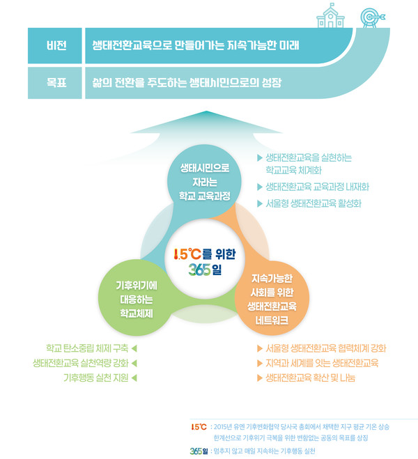 「제2기 생태전환교육 중장기 발전계획('25~'30)」은 ‘5℃를 위한 365일’이라는 슬로건 하에 ‘삶의 전환을 주도하는 생태시민으로의 성장’을 목표로, 통합·전환·실천·협력이라는 핵심 가치를 지속적으로 추구한다. 또한 대도시 서울의 특성을 반영해, 자연환경과 첨단 디지털 환경이 공존하는 ‘서울형 생태전환교육’을 새롭게 도입한다.
