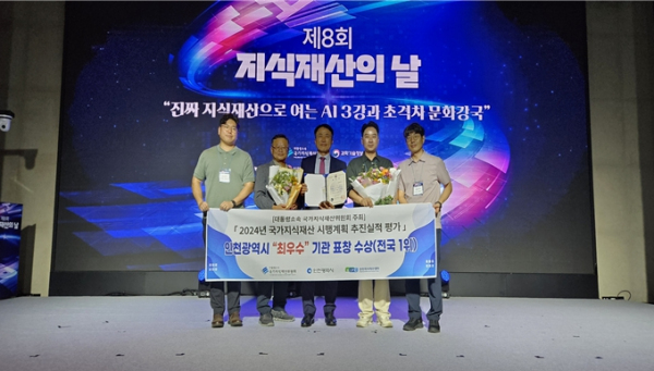 [서울시티 김청월 기자] 인천광역시는 대통령소속 국가지식재산위원회 주최로 9월 4일 서울 양재 L타워에서 열린 ‘제8회 지식재산의 날’ 기념식에서 광역지자체 부문 최우수기관으로 선정되어 국가지식재산위원회 위원장 기관표창을 수상했다고 밝혔다.