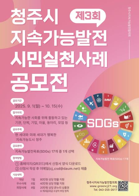[서울시티 김청월 기자] 청주시와 청주시지속가능발전협의회는 오는 10월 15일까지 ‘제3회 청주시 지속가능발전 시민실천 사례 공모전’을 개최한다고 밝혔다.