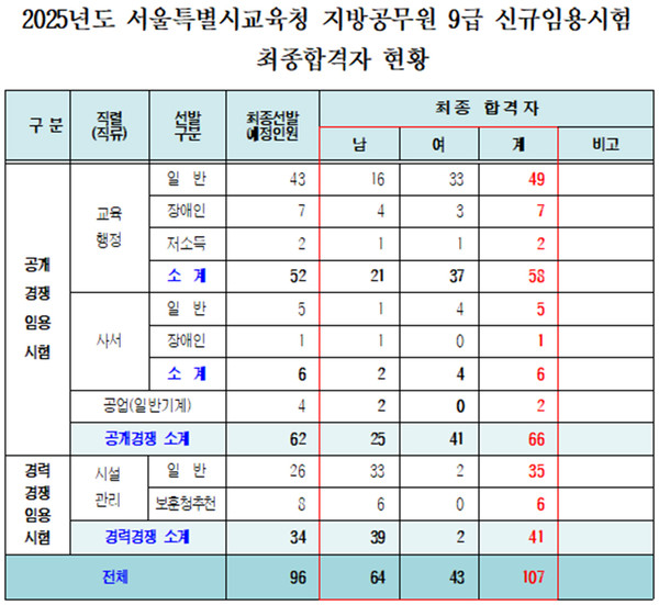올해 서울특별시교육청 지방공무원 최종합격자는 1차 필기시험에서 3,152명이 지원하여 139명이 합격하였으며, 지난달 30일 면접시험을 거쳐 최종합격자 107명이 결정됐다.