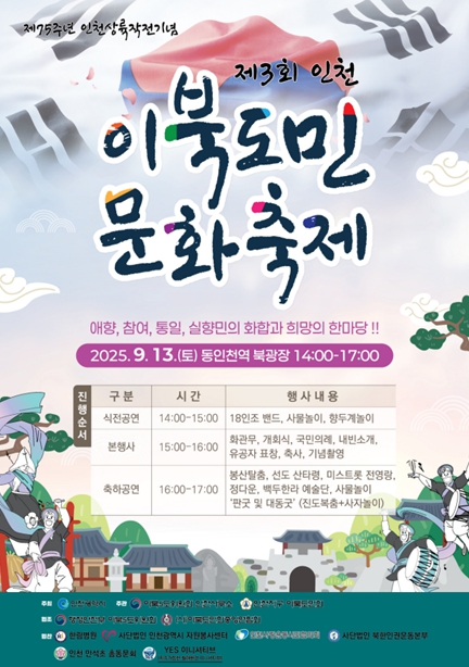 [서울시티 김청월 기자] 인천광역시는 9월 13일 동구 송현동 동인천역 북광장에서 2025 인천 이북도민 문화축제를 개최한다. 세 번째로 열리는 이번 축제는 이북도민의 문화를 홍보‧계승하고 실향민과 이산의 아픔을 위로하며 이북도민들의 사기를 높이기 위해 마련됐다.