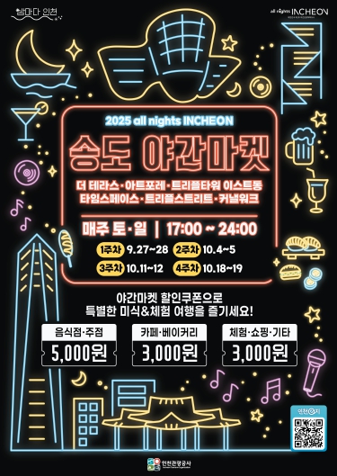[서울시티 김청월 기자] 인천광역시와 인천관광공사(사장 백현)는 9월 27일부터 10월 19일까지 매주 토·일 4주간 송도 일대 6개 상권에서 풍성한 할인혜택과 더불어 상권별 다양한 행사를 즐길 수 있는‘2025 all nights INCHEON 송도 야간마켓’을 개최한다고 밝혔다.