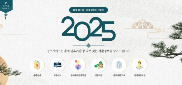 [서울시티 김청월 기자] 청주시는 시민들이 연휴 기간에 필요한 생활정보를 신속하게 얻을 수 있도록 오는 9일까지 시 누리집을 개편해 운영한다고 2일 밝혔다.