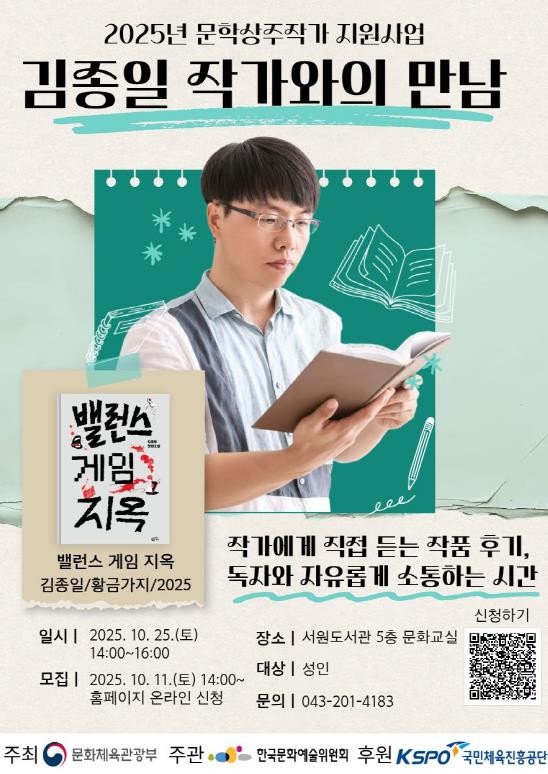 김 작가는 서원도서관 상주기간 중인 지난 9월 미스터리 스릴러 장편소설 ‘밸런스 게임 지옥’을 출간했다.