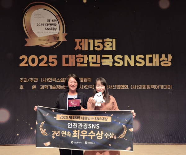 [서울시티 김청월 기자] 인천광역시와 인천관광공사(사장 백현)는 인천관광 SNS가‘2025 대한민국 SNS 대상’ 공공부문에서 최우수상을 수상하며, 2년 연속 수상의 영예를 안았다고 밝혔다.