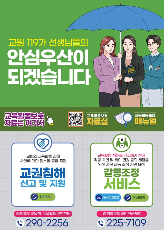[서울시티 김청월 기자] 충청북도교육청이 17일, 교권보호를 강화하고 학교 현장의 안정화를 위해 교원 119 갈등조정 서비스를 운영한다고 전했다.