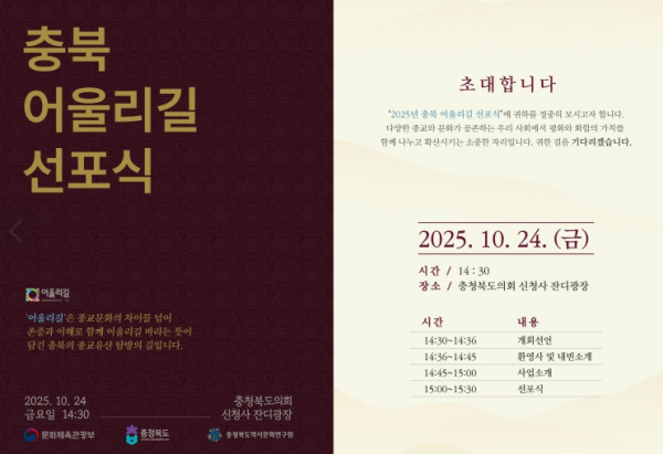 이번 행사는 그동안 충북도에서 개발한 종교유산 탐방길 ‘충북 어울리길’의 출발을 알리는 자리로, 충북 4개 종단 대표와 종교인, 도민 등 300여 명이 참석해 뜻깊은 시간을 가졌다.