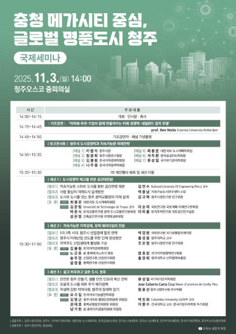원광희 청주시정연구원장은 “오늘 토론회에서 제시된 다양한 의견과 제안을 청주의 미래 정책 연구에 적극 반영하겠다”며 “도시, 교통, 문화, 사회, 환경 등 여러 분야의 연구자들이 함께 청주의 지속가능한 발전 전략을 구체화해 나가겠다”고 말했다.