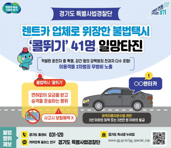 기이도 경기도 특별사법경찰단장은 “불법 콜뛰기는 면허없는 운전자와 안전검증이 이뤄지지 않은 차량으로 도민의 생명을 위협하는 범죄행위”며 “불법 콜택시 이용을 자제해 주시고, 의심되는 행위를 발견하시면 언제든지 신고해 주시길 당부드린다. 안전한 교통환경을 만들기 위해 불법 유상운송을 끝까지 추적·수사하겠다”고 말했다.